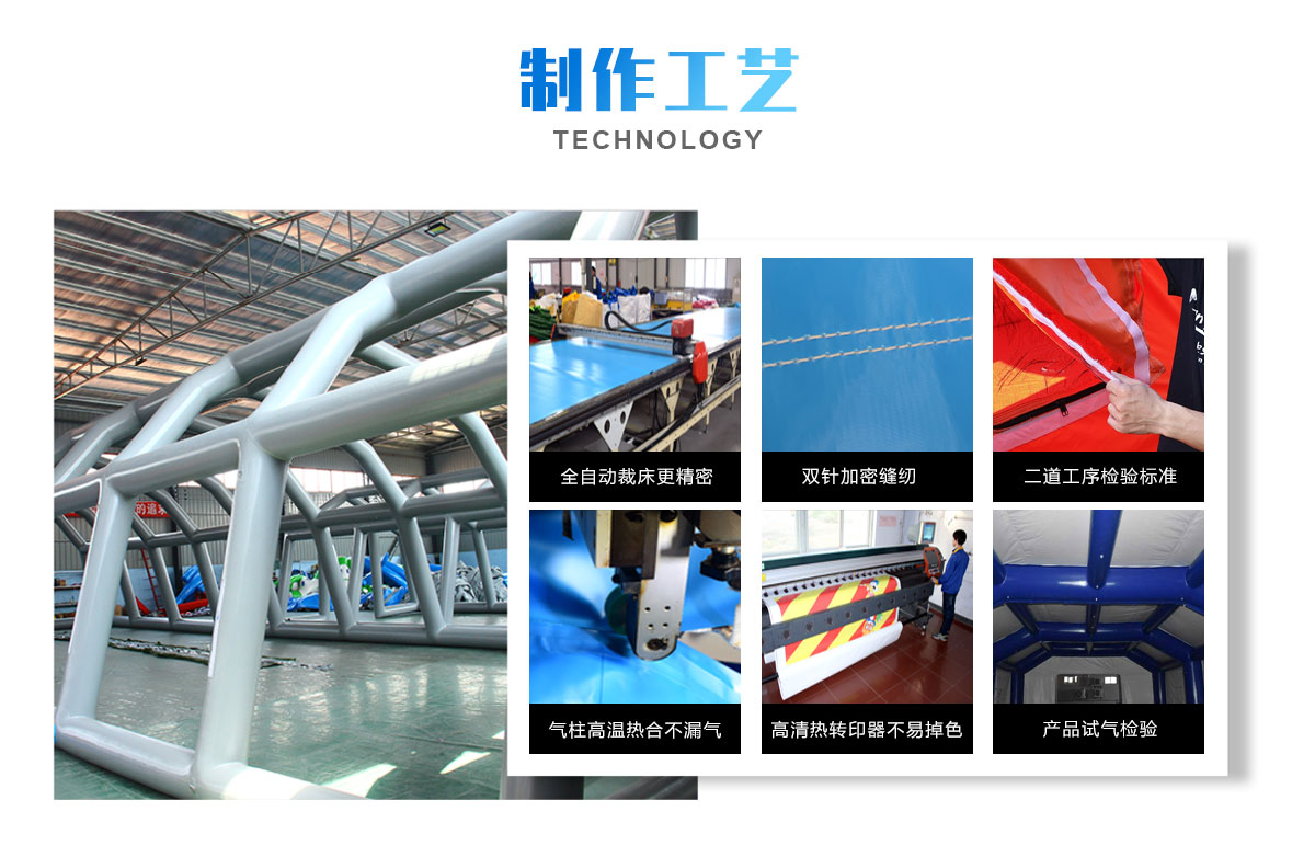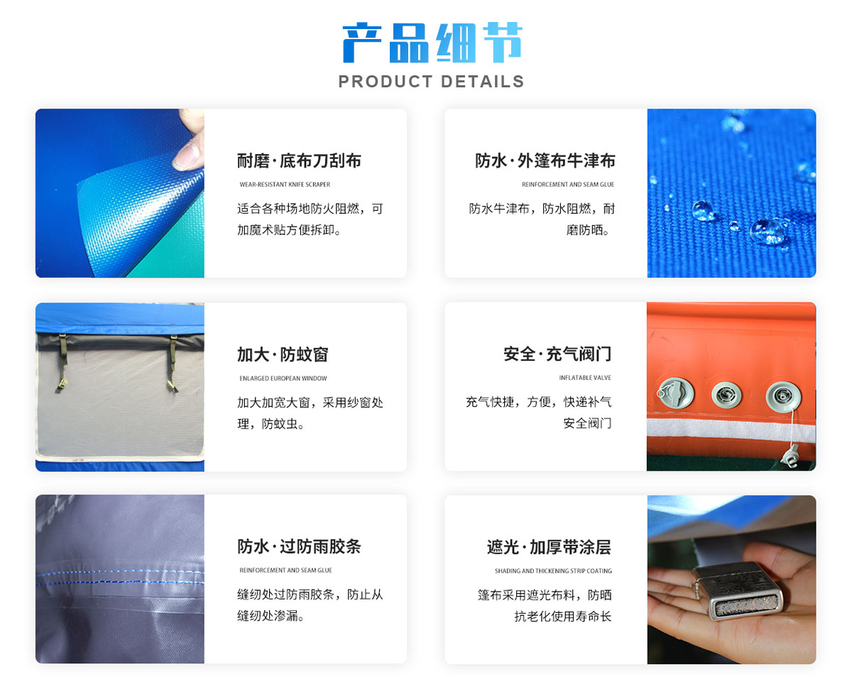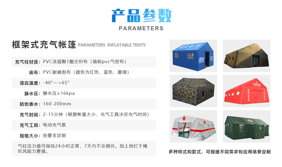 框架式午夜电影福利充氣帳篷:充氣前,體積小便於攜帶、不需搭建充氣3~5min即可成型,達到使用功能,外型阻風麵小,抗風優於鋼管結構帳篷。帳篷氣囊是采用高強高分子複合氣密布 采用高頻專用模具熱合成型。