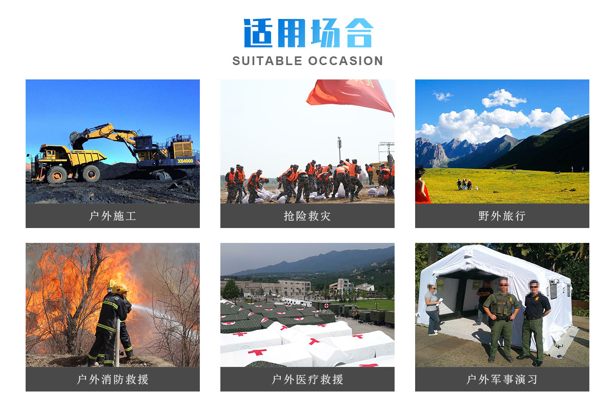 主要用於軍隊、工業、醫療、民用一般用途訓練救災、休閑。